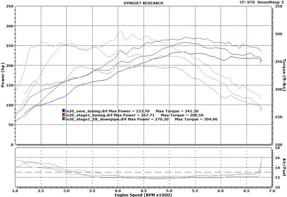 Restrictions in the exhaust system robs horsepower and torque especially on turbocharged cars. Thus, removing as much exhaust flow restrictions will increase horsepower and torque significantly. The factory catalytic converter found in the factory downpipe is a big culprit of this and is a major exhaust flow restriction. The factory catalytic converter is made up of catalyst material formed into "honeycomb" weaves. Exhaust gas must pass through these tiny "honeycomb" weaves on their way to the exhaust system thus causing a major exhaust flow restriction. It also causes turbulence after the catalytic converter which causes the exhaust flow to slow down (which increases restriction). By replacing the factory downpipe/catalytic converter with our Competition Series 4" Catless Downpipe, more power is unleashed! Our dyno testing has shown around 14-16whp average peak gains and upwards of 24wtq peak gains! While peak horsepower is nice to look at on dyno charts, what's more important is the power curve. If you look at the dyno charts, torque hits MUCH earlier and harder. The torque curve is BROADER throughout the RPM band. More usable power. You have more time spent in the RPM band with higher horsepower and torque. This equates to faster turbo spool up (less turbocharger lag) and better throttle response. Bottom line, faster. You will feel the difference instantly.