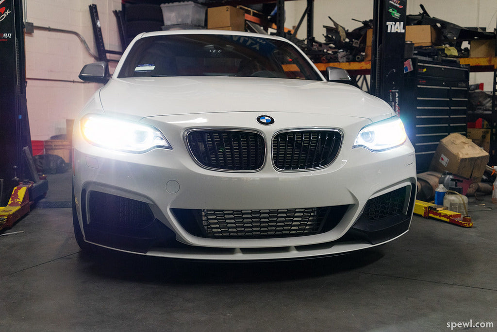 One of the first things we noticed when we started development of our Competition Series FMIC for the F Series Chassis cars is that there is much more space behind the bumper cover compared to the older E Series Chassis cars. Without any major space restrictions, we chose to move the intercooler forward from the factory location. This allowed us to have an intercooler with more frontal surface area and more direct airflow without having to sacrifice internal airflow with an odd shaped end tank. Our test data on this design showed improvements in both IATs and ability to fight off heatsoak. Another added benefit of moving the intercooler forward is that now, intercooler sits more aggressively behind the center