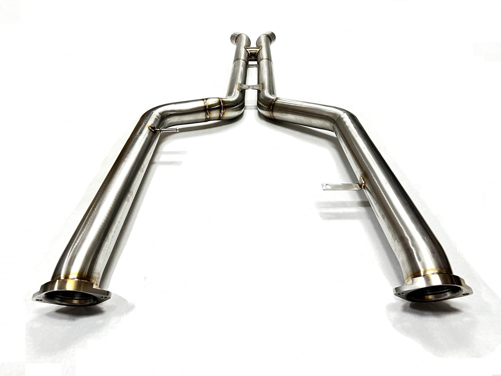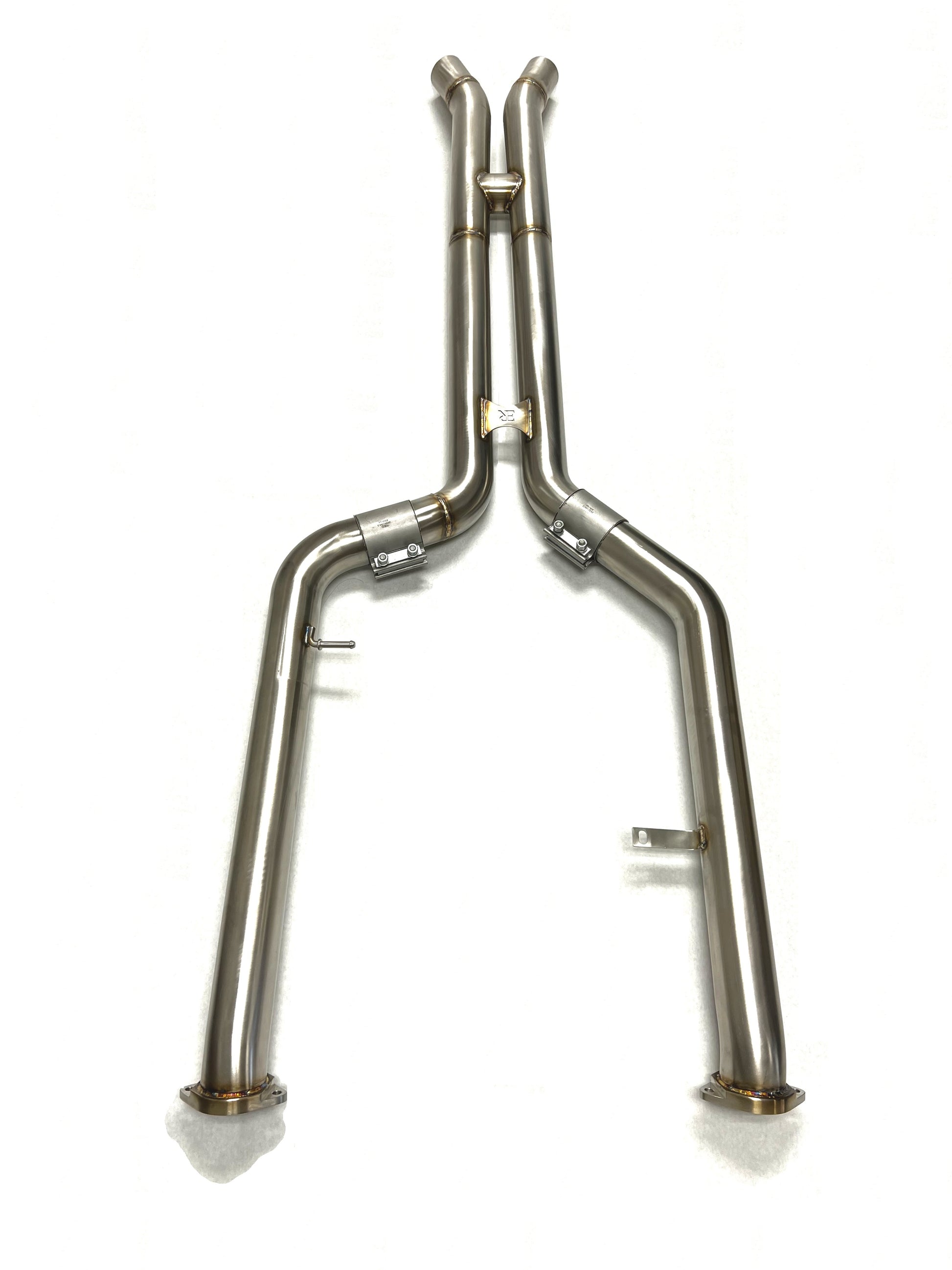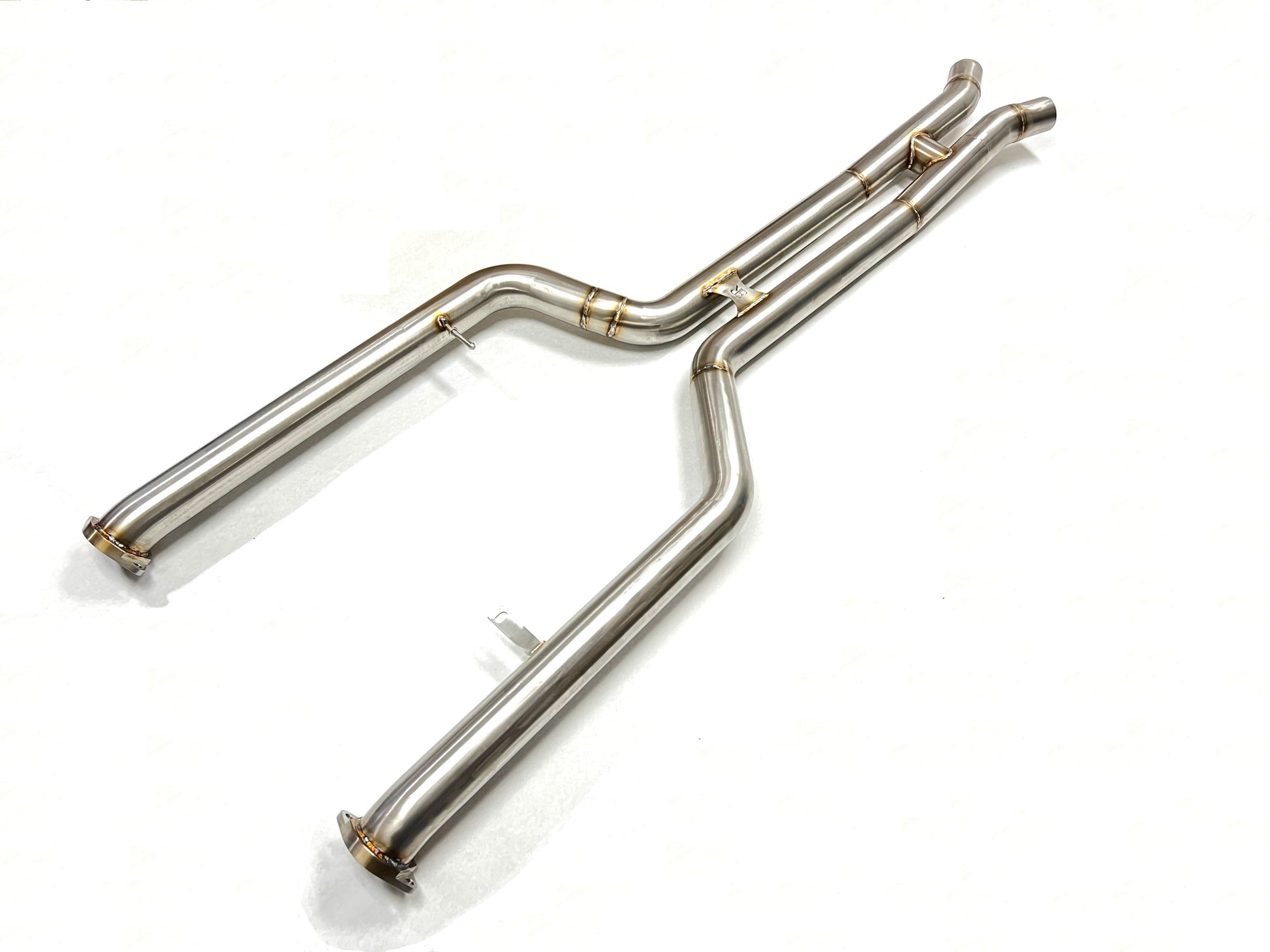 Our Competition Series Mid Pipes feature a "H" style crossover. The crossover is used to equalize the pressure between the left and right exhaust pipes. This helps promote better flow and reduce droning. Through testing between an "X" and "H" crossover design, we found the "H" crossover design helped reduce droning and improving low end torque compared to the "X" crossover design. Thus, we incorporated an "H" crossover instead of a "X" crossover. At the end of the day, this is a BMW and we do not want droning. The factory mid pipe also incorporates a "H" crossover design so we figured BMW also felt the "H" design was the ideal solution for this appliation.