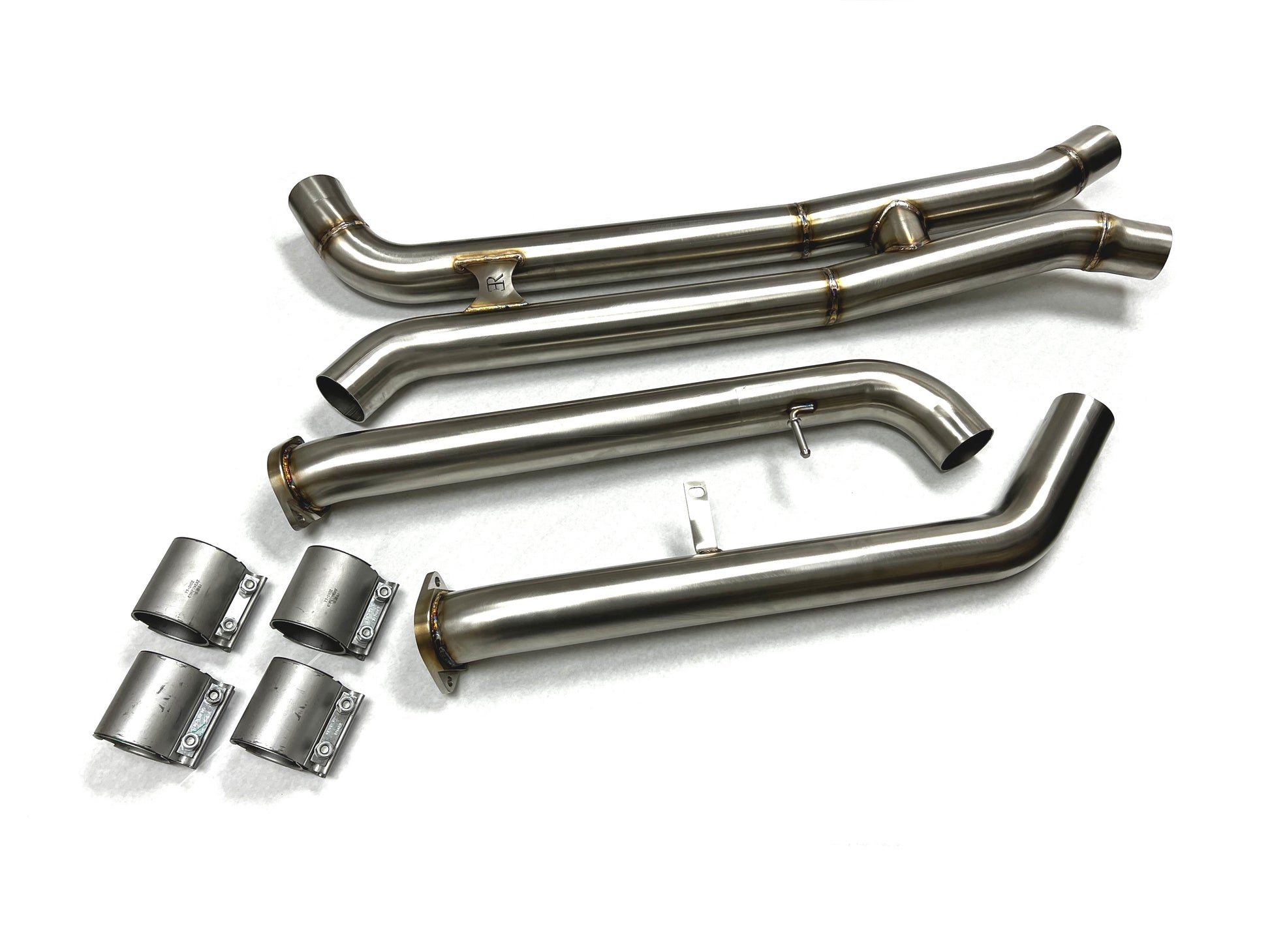 Our Competition Series Mid Pipes are constructed out of 100% 304 grade stainless steel and utilize mandrel bent piping. They are 100% TIG welded by our in house fabricators and built in the USA. Our exhaust flanges are billet stainless steel that is computer CNC precision cut. The factory bracket hanger is retained. The bracket hanger is laser cut and TIG welded using stainless steel rods. High quality exhaust clamps are used to joint the mid pipes to the rear exhaust muffler section.