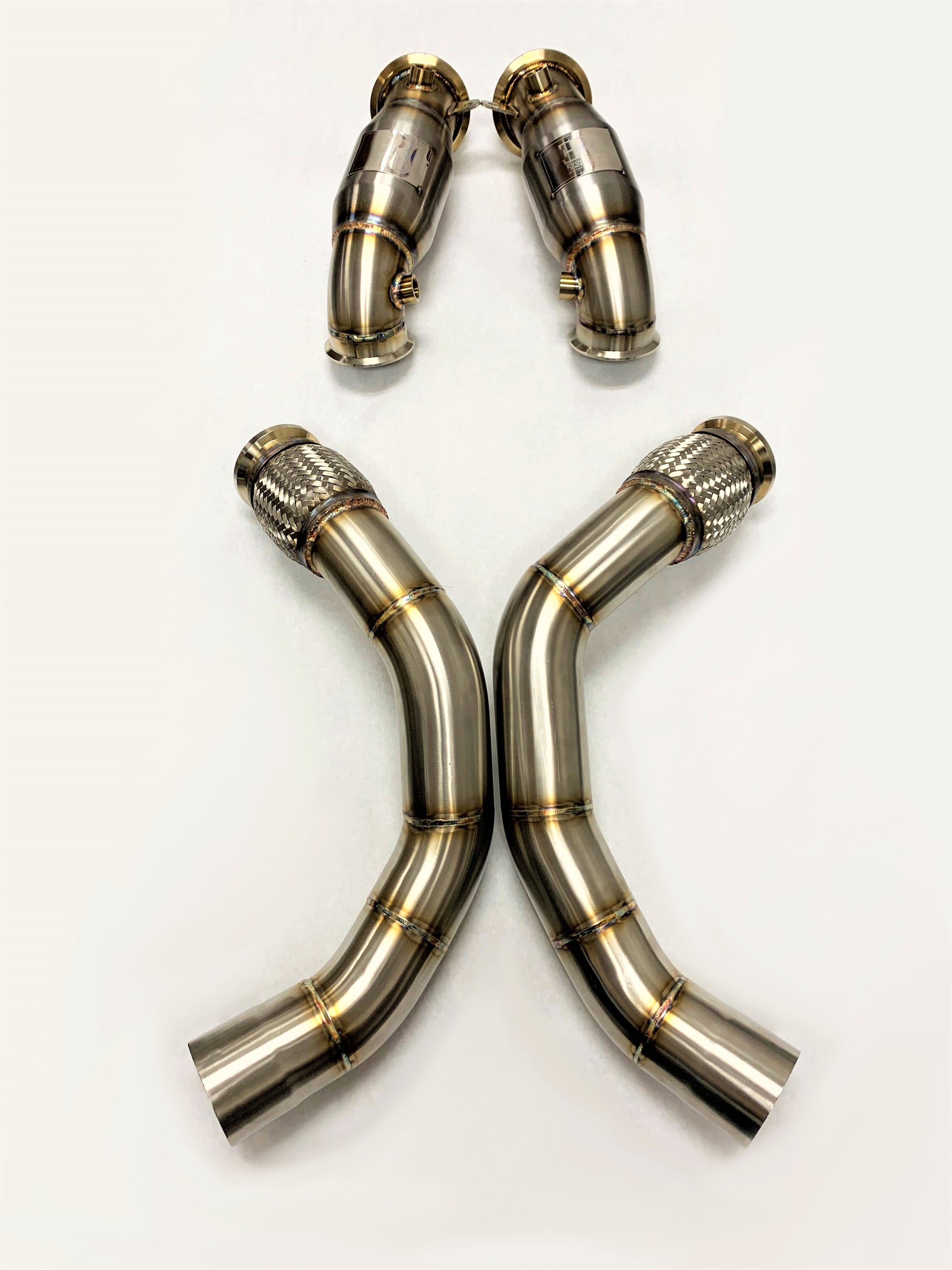 The M5 (F90) & M8 (F92/F93) has 2 primary catalytic converters and 2 secondary catalytic converters for a total of 4 catalytic converters. Our Sports Series High Flow Metallic Catted Downpipe replaces the primary catalytic converter with our high flow metallic catalytic converter and deletes the secondary ones.
